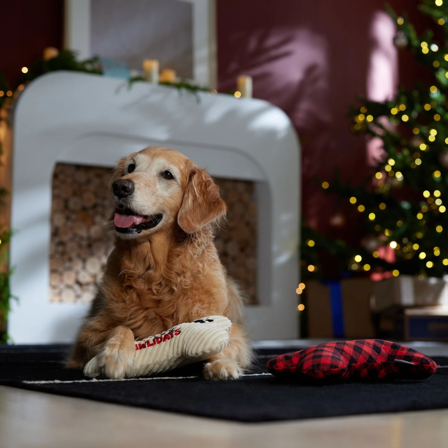 - Happy Pawlidays plush pack features two holiday-themed bone toys. One in red plaid and the other in white corduroy that reads โHappy Pawlidaysโ for double the delight.