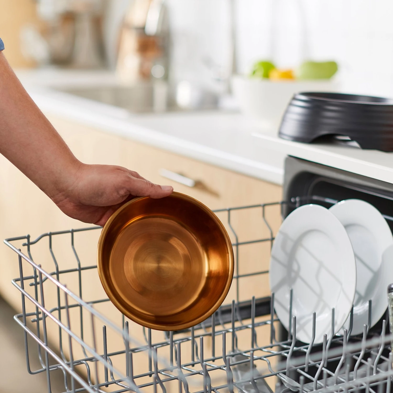 - Light copper-colored stainless steel bowl comes out of the decorative base for easy cleaning.
