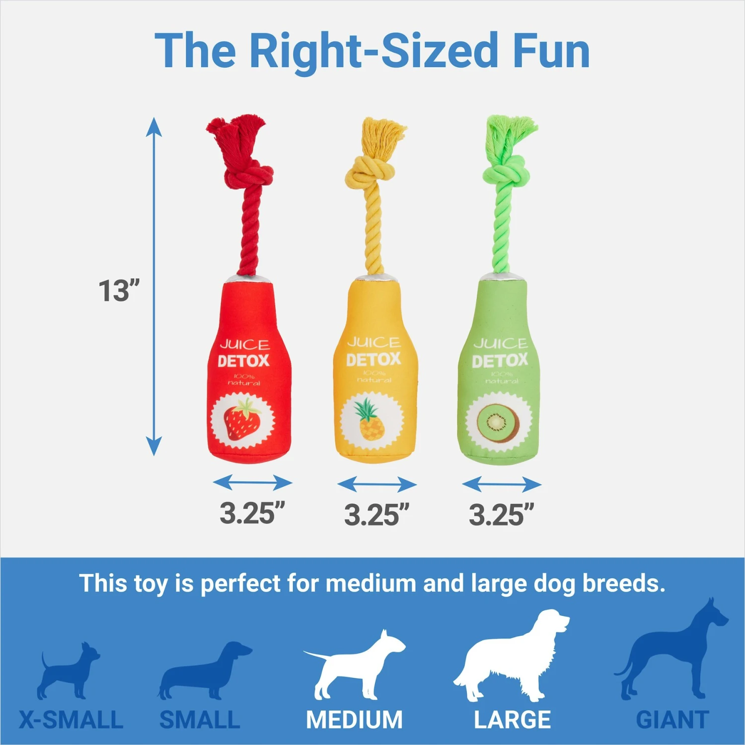 - Juice cleanse plush dog toys include sewn-in squeakers to amp up playtime and get that body moving.