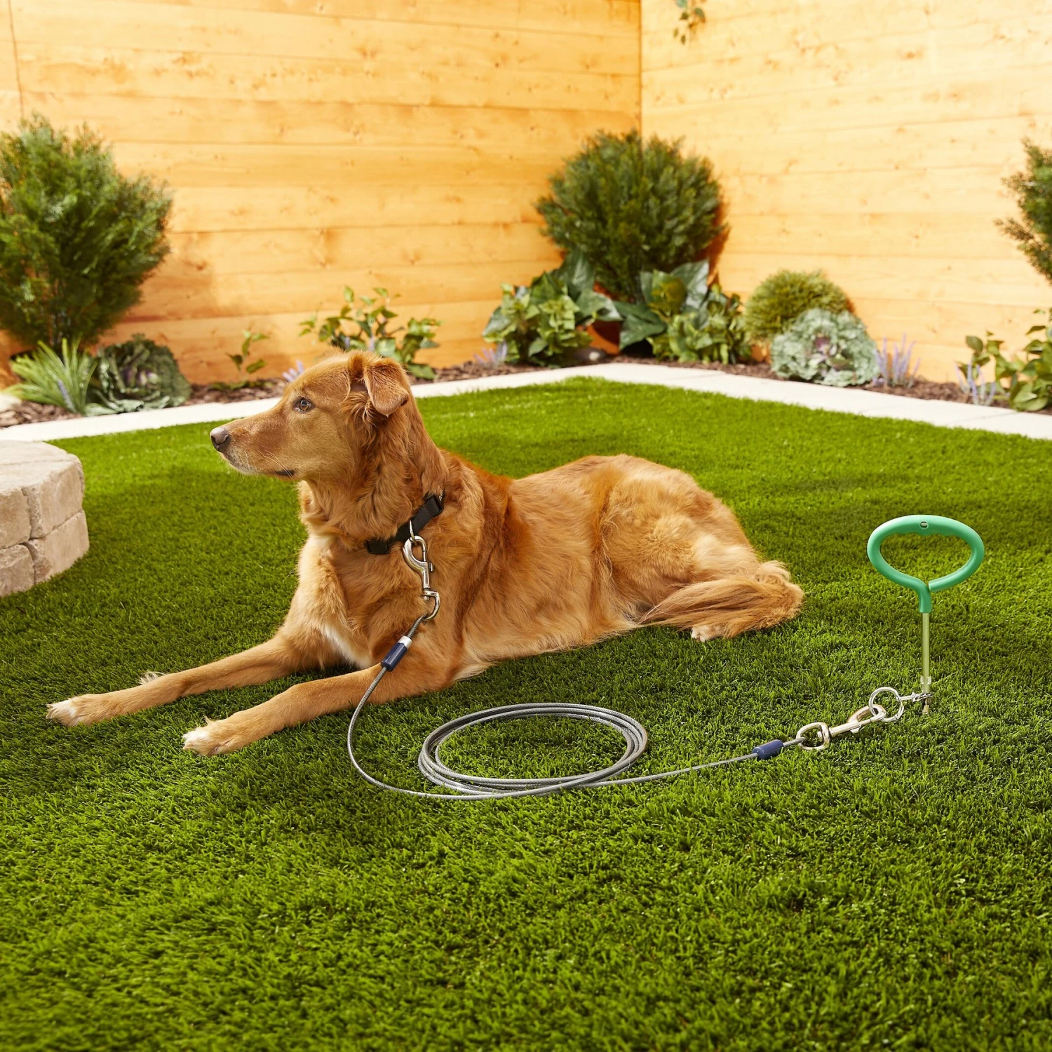 - Easy to use by clipping one of the metal swivel clips to your dogโs collar, and the other to a stake (not included).